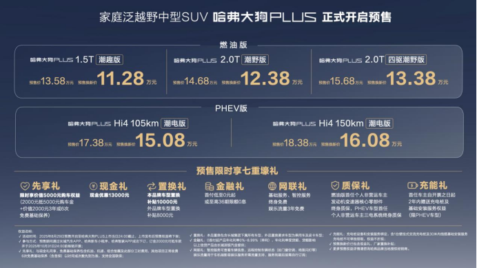 展会现场,哈弗品牌重磅消息不断:首款聚焦家庭泛越野需求的中型SUV——哈弗大狗PLUS正式开启预售;预售换新价格11.28万元至16.08万元。其中,哈弗大狗PLUS:1.5T潮趣版11.28万元、2.0T潮野版12.38万元、2.0T四驱潮野版13.38万元。哈弗大狗PLUS PHEV : Hi4 105km潮电版15.08万元、Hi4 150km 潮电版16.08万元。