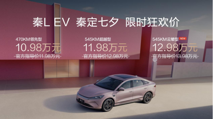 8月29日,秦L EV正式上新云辇型,搭载了云辇-C智能阻尼车身控制系统和TBC高速爆胎稳行系统两大超级“神装”,七夕宠粉价12.98万元,树立起同级产品力天花板。同时,秦L EV全系价值重塑,推出“秦定七夕 限时狂欢价”,即日起至9月30日,全系车型限时售价10.98——12.98万元,为用户提供了中级纯电轿车最优选择。