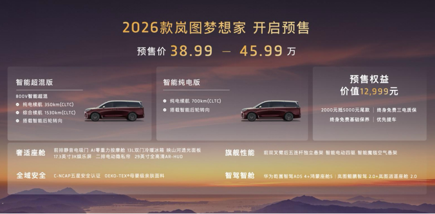 正在阅读:纯电续航超350公里 2026款岚图梦想家成都车展预售价38.99万起