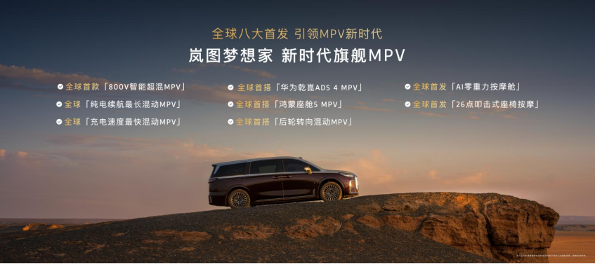 2026款岚图梦想家的核心竞争力,在于以“800V智能超混MPV”的身份,打破了传统混动传统混动MPV“纯电续航短、充电速度慢、亏电油耗高”的先天顽疾,让混动MPV有了不打折扣的全场景纯电体验。