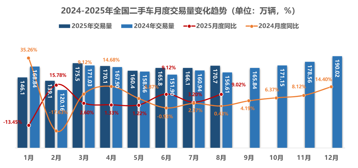 2025年8月,全国二手车市场交易量170.74万辆,环比增长2.80%,同比增长9.02%,交易金额为1065.17亿元。