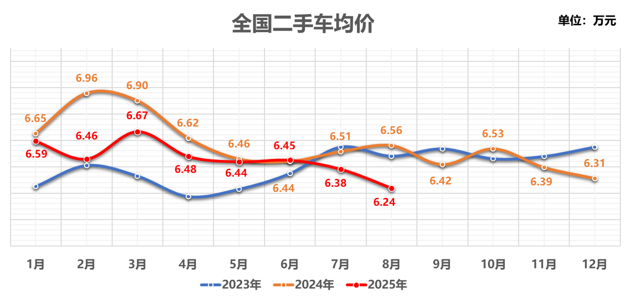8月份,二手车交易均价为6.24万元,较7份下降0.14万元,较去年同期下降0.32万元。