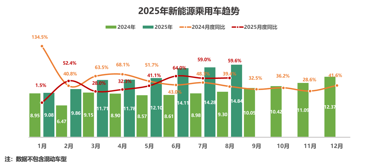 2025年8月,全国新能源二手车共交易了14.84万辆,环比7月份增长3.9%,同比去年同期增长了59.6%。