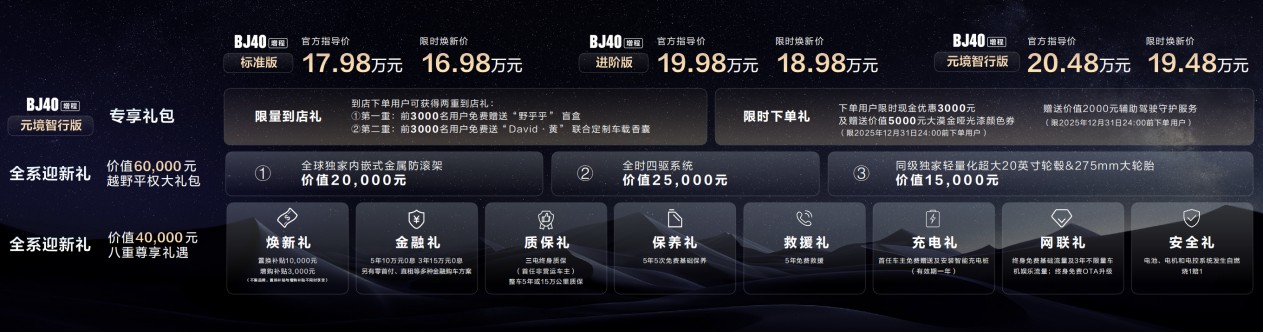 自此,BJ40增程家族一共拥有标准版、进阶版、元境智行版三个版型。北京越野还带来了BJ40增程三个版型均能享受的两大全系迎新礼。