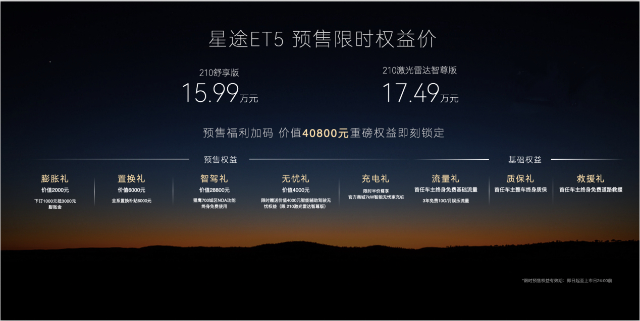 预售期间,星途ET5为下定用户准备了总价值高达40800元的重磅福利,多项预售专属礼遇现已开启:下订1000元可抵3000元购车款、全系6000元置换补贴、价值28800元的猎鹰700辅助驾驶功能终身免费、专属4000元智能辅助驾驶无忧权益限时赠送(限210激光雷达智尊版)以及官方商城7kW智能家充桩半价尊享。同时,星途还为首任车主提供三大基础权益,包括终身免费基础流量,3年10G/月娱乐流量、整车终身质保及终身免费道路救援服务,以满格诚意打造预售期用户的尊享购车体验。