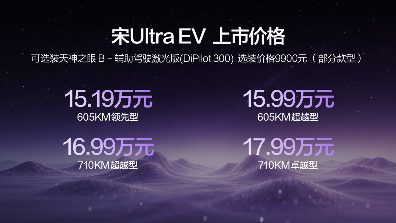 比亚迪王朝宋Ultra EV 共4款车型,包括605KM领先型、605KM超越型、710KM超越型和710KM卓越型,官方指导价15.19万-17.99万元。新车全系搭载比亚迪第二代刀片电池及闪充技术,同时拥有710公里CLTC纯电续航、天神之眼B、云辇-C、TBC高速爆胎稳行系统等豪华配置,为消费者带来全新的纯电出行方式,全面开启闪充时代。
